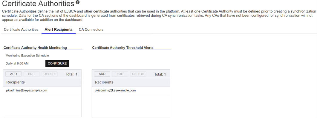 - Set the email recipients for the alerts on the alert recipients tab of the certificate authorities page.