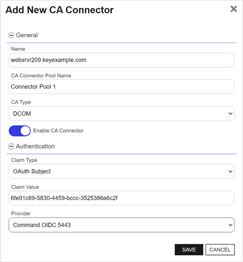 The unique identifier that serves as name of a computer. It is sometimes presented as a fully qualified domain name (e.g. servername.keyexample.com) and sometimes just as a short name (e.g. servername). lookup for the server's name. The Name field cannot be modified on an edit. - Enter a CA Connector Pool Name. Pools are used to group multiple remote CA connectors together to perform tasks on the same CA or set of CAs. A pool may only contain remote CA connectors of one type—DCOM or HTTPS. The CA Connector Pool Name field cannot be modified on an edit if the pool is in use by a CA and the connector being edited is the last enabled connector in the pool.