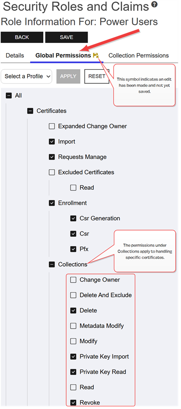 Permissions on certificates and their collections can be controlled at two levels—system-wide at the certificates-collections level and on a collection