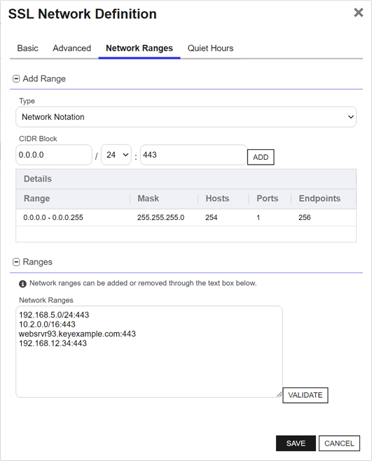 - Validates network ranges as defined. To validate the list of ranges defined for the network, click the Validate action button. Based on the result, either a green Network ranges are valid message will display, or an alert will pop up with the list of invalid ranges.
