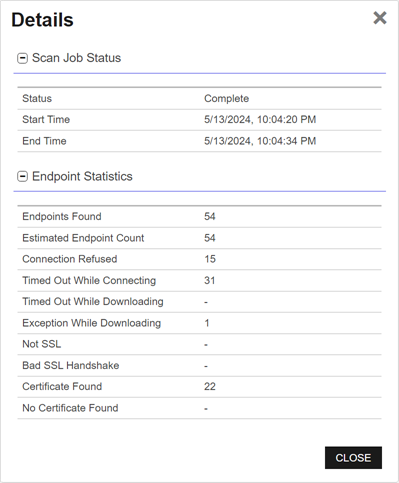 At any time, you can view the status of the latest scan jobs by viewing scan details from the SSL Discovery page. Right-click the network location in the grid and choose View Scan Details from the right-click menu or highlight the row in the network grid and click View Scan Details at the top of the grid.