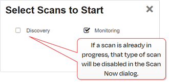 In addition to SSL scanning jobs that can be run as scheduled, the Network Definitions tab includes a feature that allows you to manually initiate a scan for a configured network at any time that a scan is not already running for the network or the network is not in quiet hours. When you initiate a scan using the scan now feature, you can choose whether to run a discovery scan, a monitoring scan, or both.