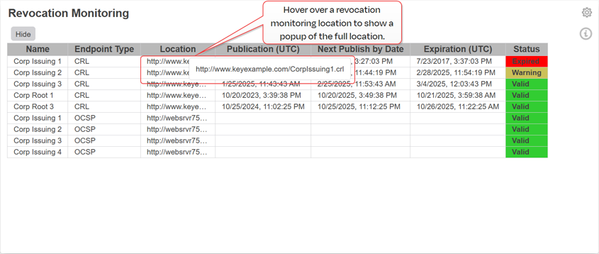 A Certificate Revocation List (CRL) is a list of digital certificates that have been revoked by the issuing Certificate Authority (CA) before their scheduled expiration date and should no longer be trusted. and OCSP location (if they have been configured to appear on the dashboard) with the path to the CRL or OCSP, the publication, next publish date, and expiration dates of the CRLs (these aren’t relevant for OCSPs) and the status of the CRL or OCSP. Hover over a value in the Location column to show a popup with the full location.