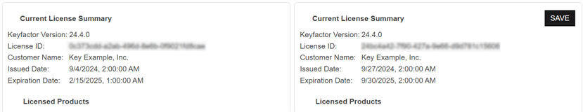 The new license will appear next to the existing license. Compare them to confirm that you wish to install the new license and then click the Save to button to complete the license change.