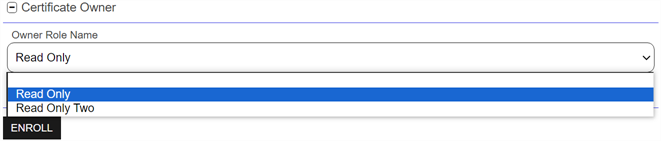 2. The Certificate Owner section of the page appears if you set the Certificate Owner Role policy to Optional or Required at either the system-wide or enrollment policy level (see Configuring System-Wide Settings and Enrollment Pattern: Policies Tab). In the Owner Role Name field, select an owner for the certificate, if appropriate. The certificate owner is a security role defined in Keyfactor Command (see Security Roles and Claims). If the user assigning the owner is an administrator, the Owner Role Name will be a search select field in which to enter the new certificate owner. To narrow the list of results in a search select dropdown, begin typing in the input field. Matching results will appear as you type. If the user assigning the owner is a limited access user, the Owner Role Name will be a dropdown. Only security roles of which the user is a member will appear in the dropdown.