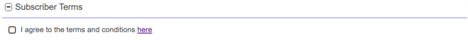 4. The Subscriber Terms section appears if the selected (or auto-selected) CA is configured to Require Subscriber Terms. For correct configuration, the URL to Subscriber Terms application setting must also be set to a value to correctly populate the URL to which the here link directs users (see Application Settings: Enrollment Tab).