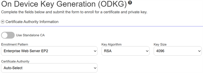 The ODKG page provides the ability to enroll for a certificate using a private keyClosed Private keys are used in cryptography (symmetric and asymmetric) to encrypt or sign content. In asymmetric cryptography, they are used together in a key pair with a public key. The private or secret key is retained by the key's creator, making it highly secure. generated on the target hosting the certificate store to which the certificate will be deployed. This option is supported for selected certificate store types (see Certificate Store ODKG).