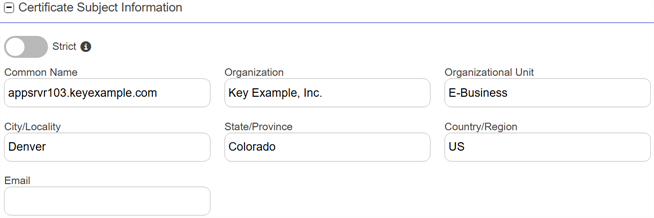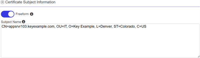 If desired, click the Strict toggle to change to the Freeform subject entry form. The freeform subject entry form can be used to enter certificate subjects that contain fields not supported by the Strict form. Data should be entered in the Freeform subject field in X.500 format.