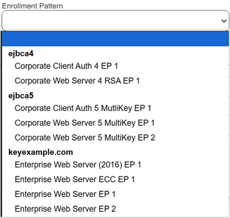 The enrollment patterns are organized by configuration tenantClosed A grouping of CAs. The Microsoft concept of forests is not used in EJBCA so to accommodate the new EJBCA functionality, and to avoid confusion, the term forest needed to be renamed. The new name is configuration tenant. For EJBCA, there would be one configuration tenant per EJBCA server install. For Microsoft, there would be one per forest. Note that configuration tenants cannot be mixed, so Microsoft and EJBCA cannot exist on the same configuration tenant. (formerly known as forestClosed An Active Directory forest (AD forest) is the top most logical container in an Active Directory configuration that contains domains, and objects such as users and computers.). If you have multiple configuration tenants and enrollment patterns with similar names, be sure to select the enrollment pattern in the correct configuration tenant.