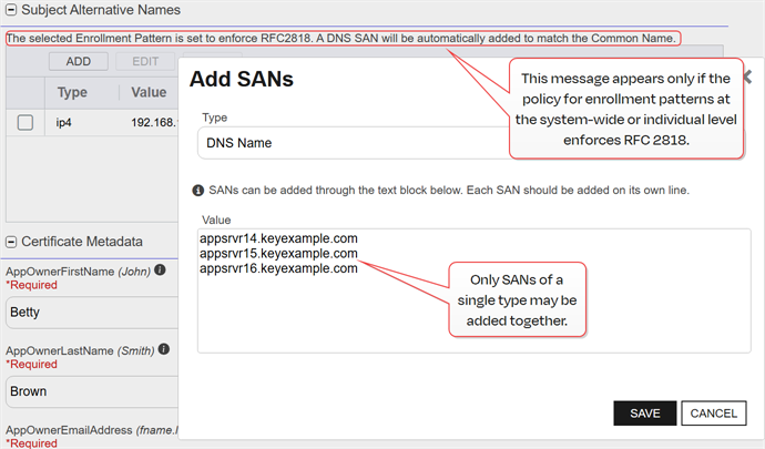 Important:  If the Enforce RFC 2818 Compliance option has been enabled for the selected enrollment pattern (see Enrollment Pattern Operations) or system-wide, a SAN will automatically be added with a DNS SAN matching the CN entered for the certificate. This SAN will not appear in the grid and cannot be edited.