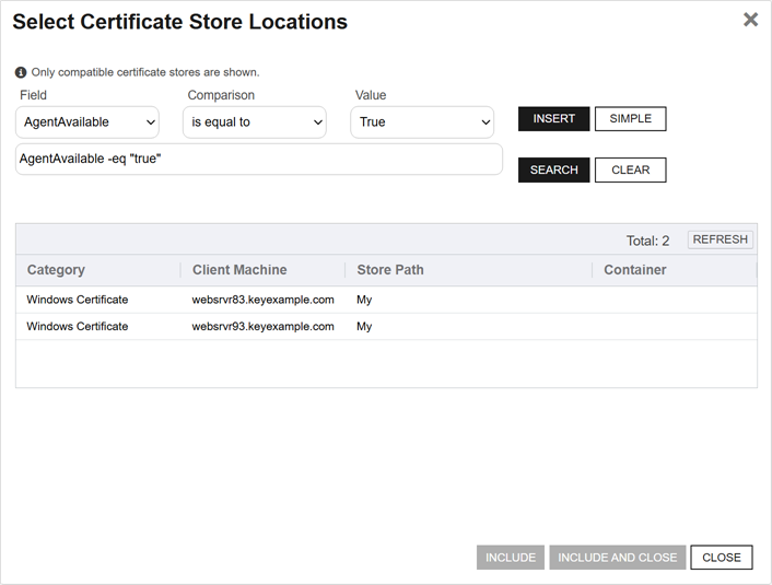 3. In the Certificate Delivery Format section of the page, select Include Certificate Stores to open the Select Certificate Store Locations dialog.