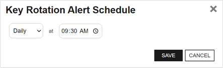 - On the Key Rotation Alerts page, click the Configure button at the top of the Key Rotation Alerts page to configure an alert execution schedule. This defines the frequency with which key rotation alerts are sent. This type of alert is scheduled for daily delivery at a specified time.