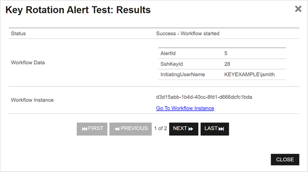 In the Key Rotation Alert Test: Results dialog, you can review the generated key rotation alerts to confirm that the substitutable special text is being replaced as expected and the recipients are as expected. Scroll the First, Previous, Next and Last buttons at the bottom of the dialog. The number of alerts generated will display between the navigation buttons.