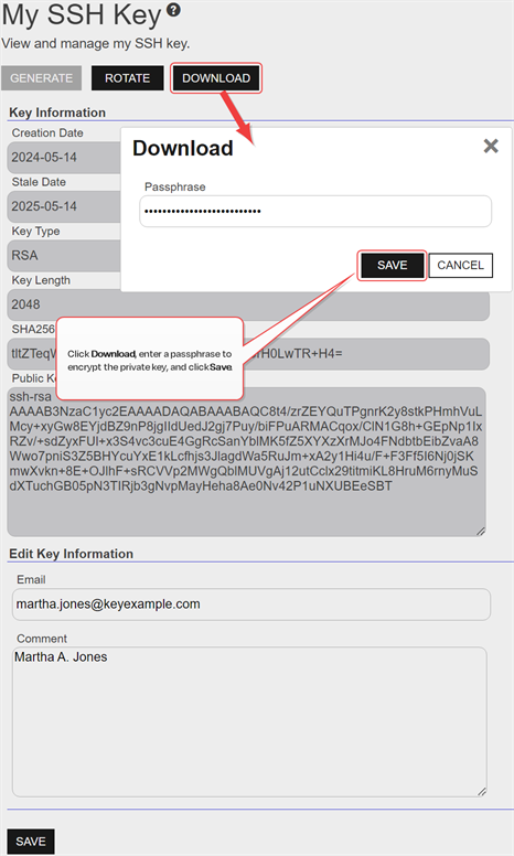 The rotate dialog defaults to all the existing settings of the user's current key. At its simplest, users may choose to accept all the defaults, enter a passphrase to encrypt the downloaded private key and click save to generate the new key pair.