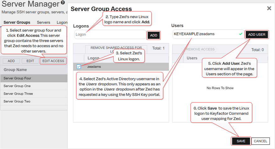 Uses the Keyfactor Command Management Portal to create Linux logons for Zed on each of the three servers that Zed should have access to and map Zed's new public key