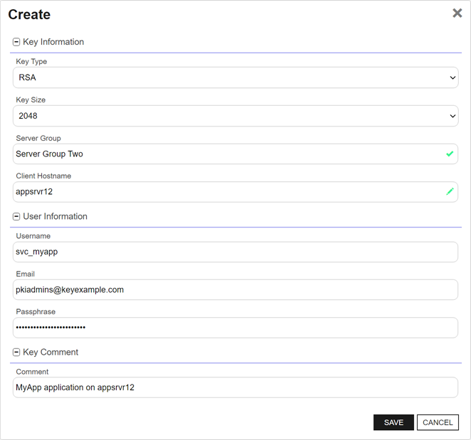 - Uses the Keyfactor CommandManagement Portal to create a new key pair (see Create a Service Account Key). She enters the following information in the form: