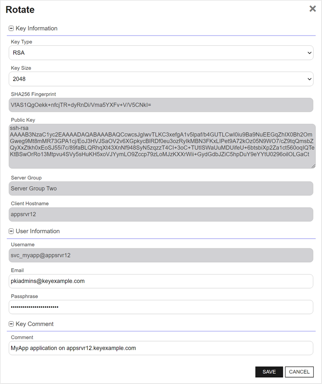 Tip: Once the key pair is generated, an administrator needs to download the private key as an encrypted file and store it locally on the machine from which the service will make SSH connections using the private key. Additionally, an administrator needs to use Keyfactor Command to map the full user name built from the username and client hostname entered when generating the service account key pair (e.g., svc_myapp@appsrvr12) to the Linux logon account that the service account will operate as when logging in via SSH on the target server(s) where the public key needs to reside (see Edit Access to a Server Group, Edit Access to an SSH Server, or Add or Edit Access for an SSH Logon). After this is complete and the orchestrator