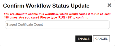 If the task has run to create the temporary table of certificates that newly meet the query criteria of the specified certificate collection but a workflow has not yet run for the given collection—perhaps it is disabled or has not yet been created—there is a window of time (until the temporary table is cleared) during which if a workflow is created or enabled for the certificate collection, the user creating or enabling the workflow will receive a warning message indicating that the workflow will run multiple times and asking the user for confirmation to continue. The user must enter RUN followed by the number of workflow instances that will be initiated to continue.