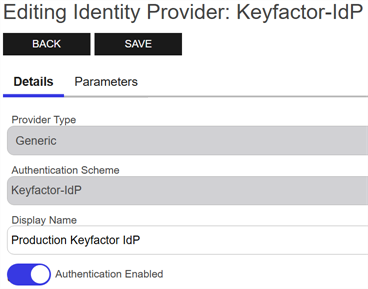 Important: The value in the Authentication Scheme field must match the provider name referenced in redirect URLs.The Authentication Enable toggle only appears when editing an existing identity provider. Newly added identity providers are always enabled. Existing identity providers may be disabled, if desired. An identity provider cannot be disabled if it is used as the default identity provider for login. When an identity provider is disabled, users cannot authenticate to the AnyCAGateway REST portal or API using it.