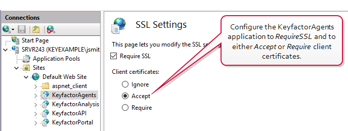 Tip: If your KeyfactorAgents endpoint is running on a standalone server with no other Keyfactor roles, you may also configure your server to Require or Accept for Client certificates at the Default Web Site level. It is good security practice to check the Require SSL box. If your KeyfactorAgents endpoint is running on a server with other Keyfactor roles, you do not need to accept client certificates at this level and should not require them at this level.