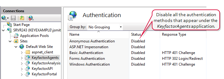 Tip: If your KeyfactorAgents endpoint is running on a standalone server with no other Keyfactor roles, you should also disable all authentication methods at the Default Web Site level as in step two. If your server holds other Keyfactor roles, leave this in the default configuration with Anonymous being the only authentication method enabled as in step one. -