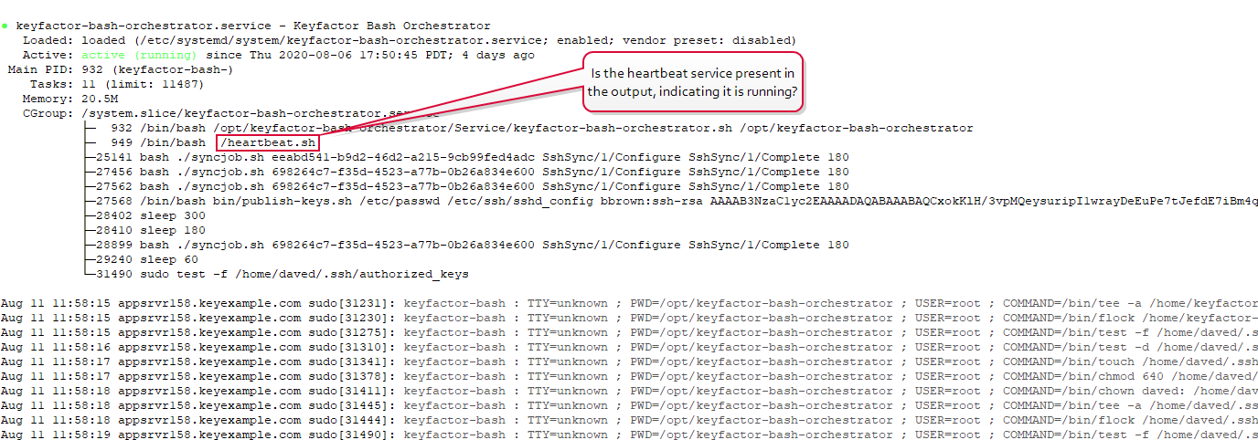Output from this command should look something like that shown in Figure 545: Status for the Keyfactor Bash Orchestrator Service. If you don't see heartbeat.sh in the output, the heartbeat service is not running.