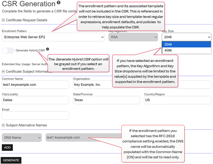 4. At the bottom of the page, click the Generate button. A success message will appear if the process completes successfully. However, if a regular expressionClosed A regular expression--RegEx--is a pattern used to validate data by ensuring it meets specific criteria. Several fields on the CSR enrollment, CSR generation, and PFX enrollment pages support RegEx validation, including certificate subject and metadata fields. has been defined system-wide or at the enrollment pattern level (see Enrollment Pattern: Enrollment RegExes Tab) for any fields on the CSR and the validation fails, an error notice will be displayed at the top of the CSR generation page. The error message will reflect the configuration defined at the enrollment pattern level, as it takes precedence over system-wide settings.