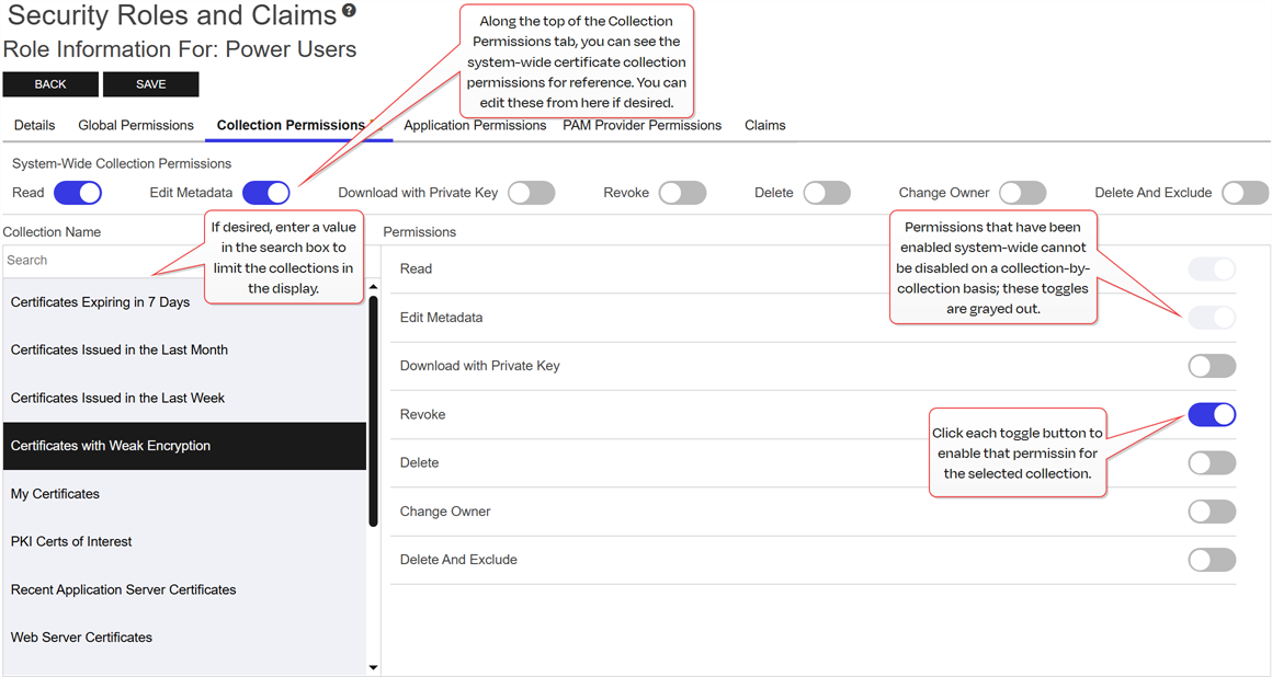 Permissions on certificates and their collections can be controlled at two levels—system-wide at the certificates-collections level and on a collection