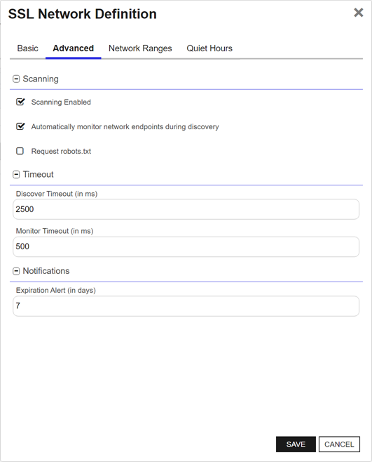 - Monitor Timeout (in ms): Enter the amount of time (in milliseconds) the scan will wait (before timing out) to receive the discovered endpoint certificate expiration details.