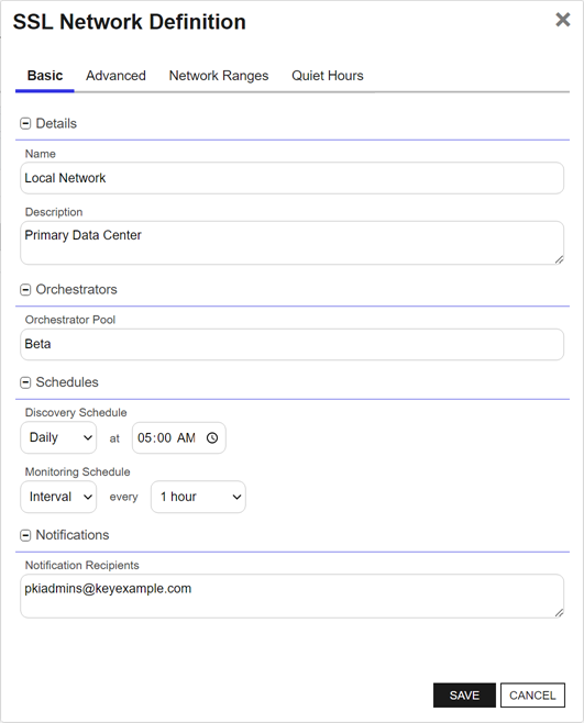 The SSL Network Definition dialog is divided into four tabs: Basic, Advanced, Network Ranges, and Quiet Hours. Enter the network information for each tab, as required. Each tab is described in detail below.