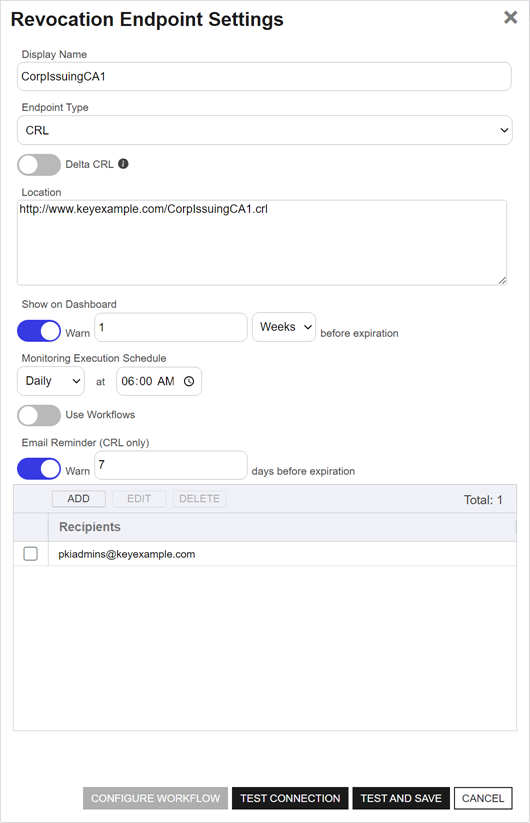 - If you toggled the Use Workflows option to disabled, you will see the Email Reminder (CRL only) and Recipients sections of the page. To configure an email reminder, click the Warn toggle to enable the option and set the number of days ahead of expiration that email reminders should begin to be sent.
