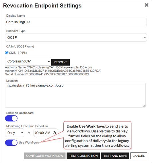 To test the value entered in the Location field to determine if the referenced CRL or OCSP URL can be reached without saving the alert, click Test Connection. To save the alert and test the value in the Location field at the same time, click Test and Save. Records can be saved even if the test fails. Click Cancel to cancel. If you’re editing an existing alert and the alert has been configured to Use Workflow, you can click Configure Workflow to open the linked workflow for editing.