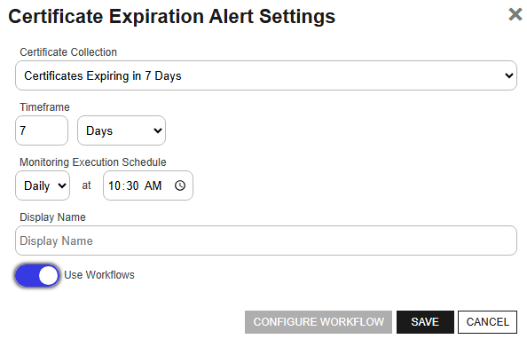 Note:  Expiration alerts support using either the legacy alerting system to deliver alerts or the newer workflowClosed A workflow is a series of steps necessary to complete a process. In Keyfactor Command, it refers to the workflow builder, which allows you to automate event-driven tasks such as when a certificate is requested, revoked or found in a certificate store. system. The workflow system offers more options for injecting actions in the process than the legacy alerting system. To configure an alert to use the workflow system for alerting, toggle Use Workflows to enable the option and create a workflow for the alert (see details below).
