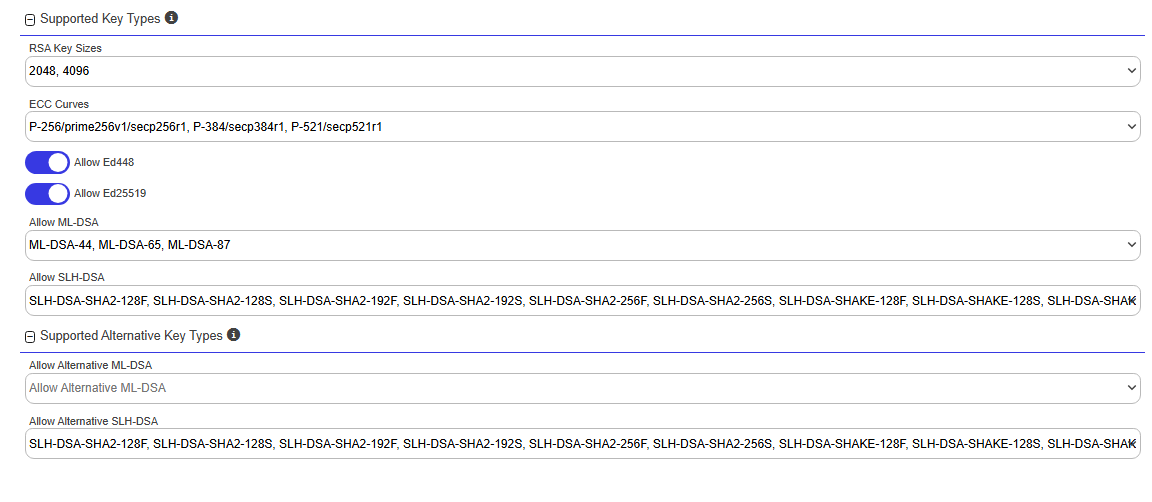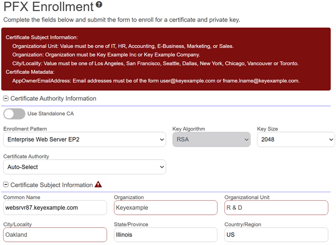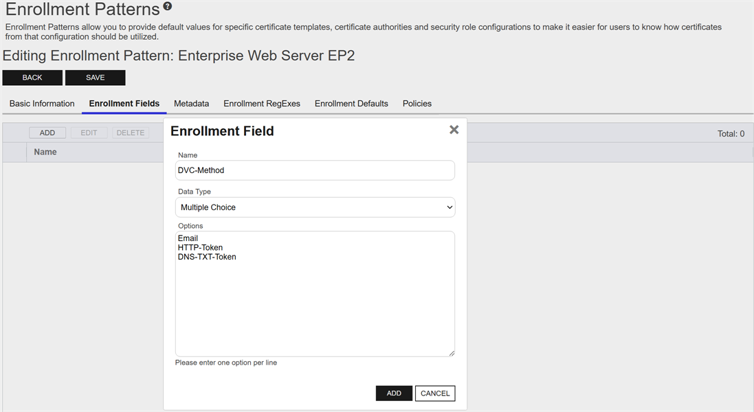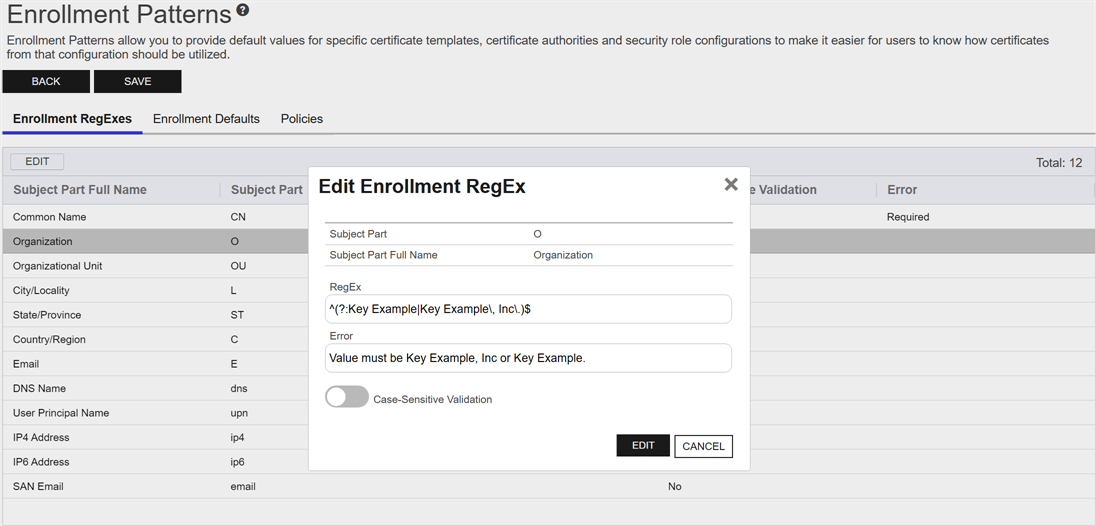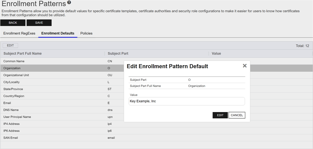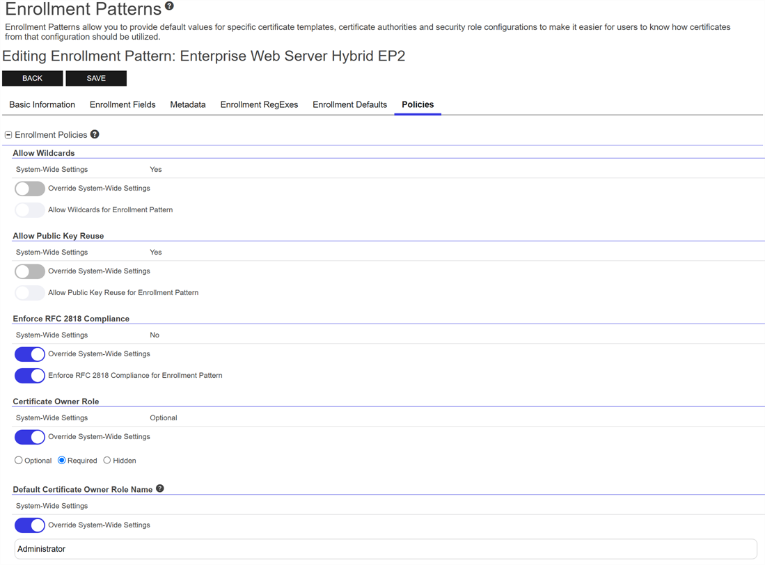 EnrollmentClosed Certificate enrollment refers to the process by which a user requests a digital certificate. The user must submit the request to a certificate authority (CA). patterns in Keyfactor Command provide a flexible way to streamline certificate enrollment by defining default values, policies, and access configurations for specific certificate templates and certificate authorities. This functionality helps reduce duplication of templates at the CAClosed A certificate authority (CA) is an entity that issues digital certificates. Within Keyfactor Command, a CA may be a Microsoft CA or a Keyfactor gateway to a cloud-based or remote CA. level while meeting diverse business requirements. On this page, you can manage enrollment patterns by adding, editing, and deleting them, configuring system-wide settings, and copying existing patterns to create new ones. These operations ensure enrollment processes are tailored to user groups, enforce security policies, and simplify certificate management.