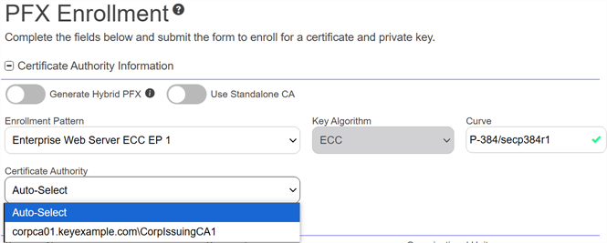 1. In the Certificate Authority Information section, slide the Generate Hybrid PFX toggle to enable this option, if desired. This option allows you to add a second key to the certificate.