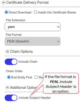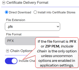 12. In the Certificate Delivery Format section of the page, select either Direct Download—to download the certificate immediately—or Install into Certificate Stores—to schedule the certificate to be added to one or more configured certificate stores. If you do not have any configured certificate stores, the Install into Certificate Stores option will not appear.