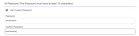 10. If enabled, in the Password section of the page, check the Use Custom Password box and enter and confirm a custom password to use in securing the PFX file. This section only appears if the Allow Custom Password application setting is set to True. The value in the Password Length field in application settings is shown for guidance when entering a password. For more information about both of these settings, see Application Settings: Enrollment Tab.
