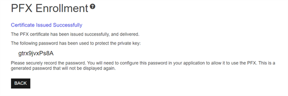 • Your browser will begin download of your certificate unless you chose to install it directly into a certificate store. If you have not selected the option to enter a custom password, you’ll see a one-time password that has been generated to secure the PFX file. You will need this password in order to open the PFX file.