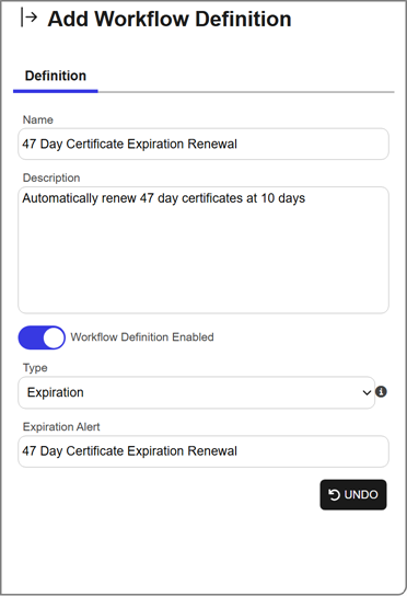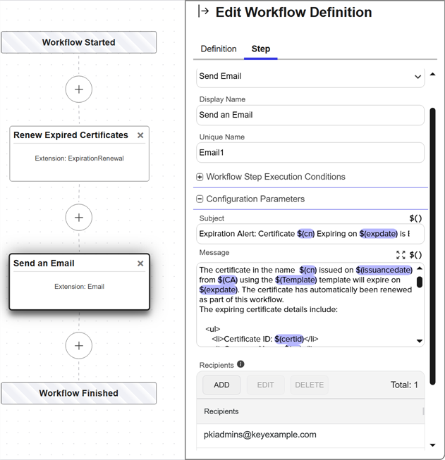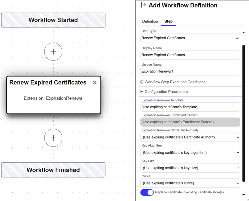 A workflow is a series of steps necessary to complete a process. In Keyfactor Command, it refers to the workflow builder, which allows you to automate event-driven tasks such as when a certificate is requested, revoked or found in a certificate store. definitions. For instructions on creating a workflow definition, see Adding, Copying or Modifying a Workflow Definition.