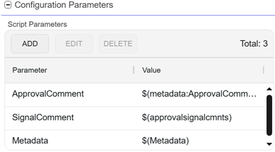 To create this, in the Set Variable Data step add Script Parameters to pull the current value of the ApprovalComments (or equivalent) metadata field, the approval signal comments entered when the approver(s) approve the request, and the full metadata set into the script as shown in Approval Comment Update Example: Add Parameters.