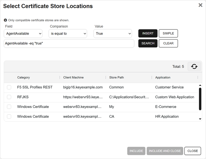 7. In the Install into Certificate Locations section of the page, select each certificate store location to which you want to distribute the certificate, if desired. To do this, click the Include Certificate Stores button. This will cause the Select Certificate Store Locations dialog to appear. Make your certificate store selections in this dialog as described in Select Certificate Store Locations, below, and click Include and Close. You will then see some additional fields on the page. Populate these as per Add to Certificate Stores and Information Required for Certificate Stores, below.