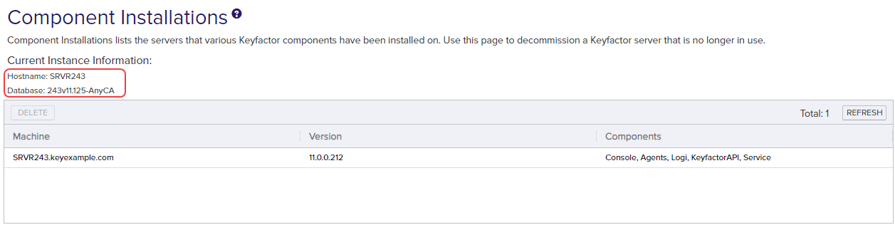 On the Component Installations page you can view the components installed on each of your Keyfactor Command servers and, optionally, delete a server if it has been removed from service. The server Hostname