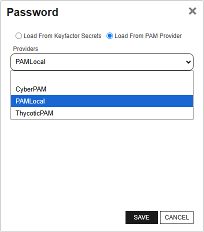 • Set/Update Password: In the Password dialog, choose ClosedLoad from Keyfactor Secrets or ClosedLoad From PAM Provider, and follow the respective instructions.