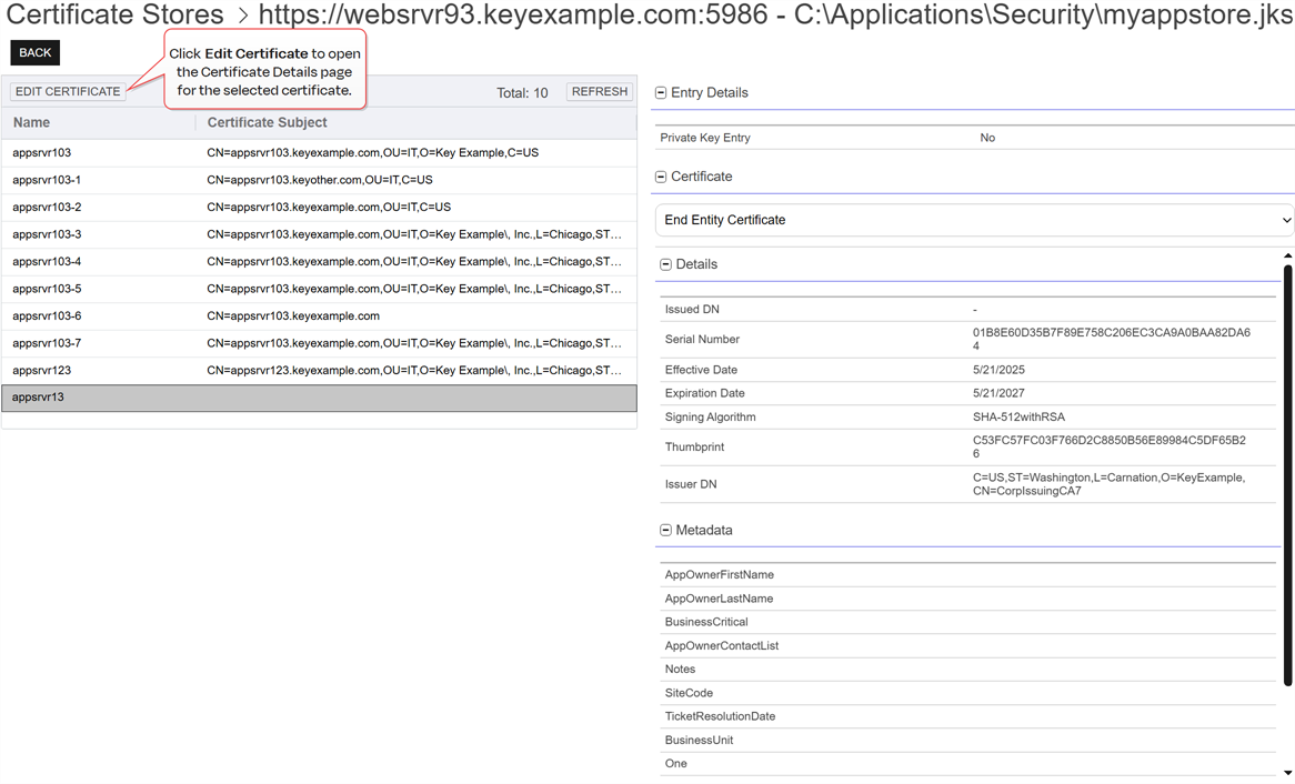 To select a single row in the certificate store grid, click to highlight it and then select an operation from either the top of the grid or the right-click menu. The delete, schedule inventory and assign application operations can be done on multiple certificate stores at once. To select multiple rows, click the checkbox for each row on which you would like to perform an operation. Then select an operation from the top of the grid. The selected stores must all be of the same category (e.g., PEMClosed A PEM format certificate file is a base64-encoded certificate. Since it's presented in ASCII, you can open it in any text editor. PEM certificates always begin and end with entries like ---- BEGIN CERTIFICATE---- and ----END CERTIFICATE----. PEM certificates can contain a single certificate or a full certifiate chain and may contain a private key. In general, extensions of .cer and .crt are certificate files with no private key, .key is a separate private key file, and .pem is both a certificate and private key. or Java) to perform the assign application operation. The right-click menu supports operations on only one store at a time.