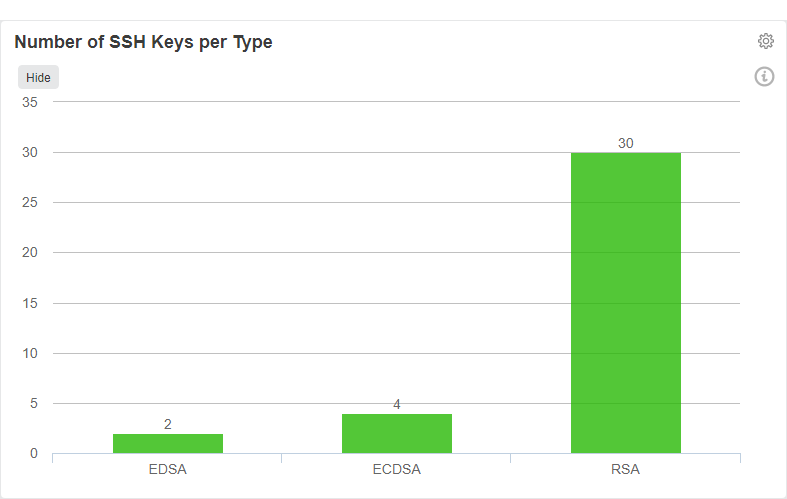The SSH (secure shell) protocol provides for secure connections between computers. It provides several options for authentication, including public key, and protects the communications with strong encryption. Keys per Type panel on the legacy dashboard shows a bar chart of all SSH keys in the Keyfactor Command database. The chart includes both managed keys (those generated within Keyfactor Command using My SSH Key (see My SSH Key Operations) or the service account key page (see Service Account Key Operations) and unmanaged keys (see Unmanaged SSH Key Operations). Hover over a bar to see the number of SSH keys in the category.