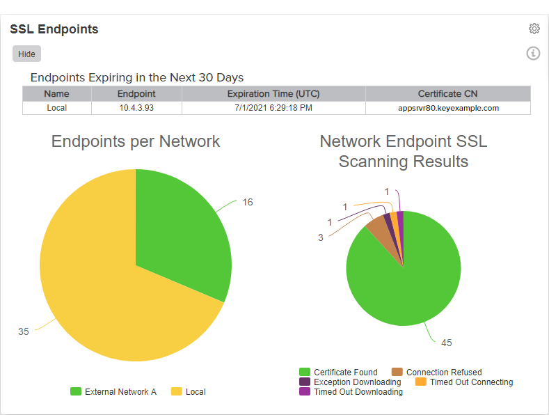 A common name (CN) is the component of a distinguished name (DN) that represents the primary name of the object. The value varies depending on the type of object. For a user object, this would be the user's name (e.g. CN=John Smith). For SSL certificates, the CN is typically the fully qualified domain name (FQDN) of the host where the SSL certificate will reside (e.g. servername.keyexample.com or www.keyexample.com)., if any. - The Endpoints per Network pie chart shows discovered SSL endpoints broken down by SSL network. All discovered endpoints are included. This includes endpoints at which a certificate is currently being found, endpoints at which a certificate was found in the past but is no longer found, and endpoints that responded in some way on scan but did not present a certificate. Click on a section of the pie chart to be taken to the SSL Discovery Results page. Click any of the labels below the pie chart to toggle add/remove that segment of the pie from the chart.