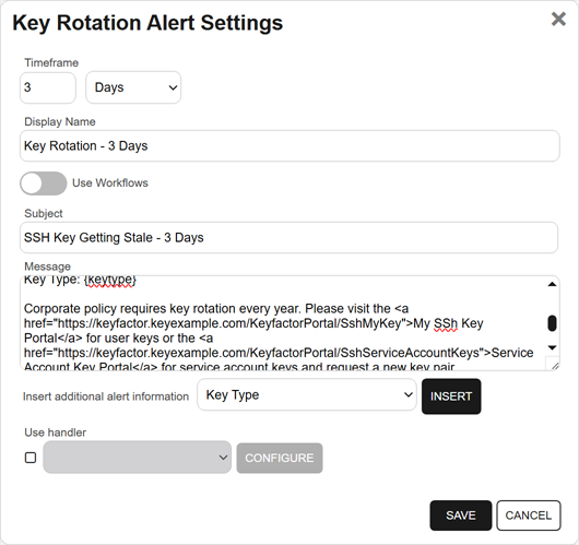 Figure 173: Create an SSH Key Rotation Alert with Workflow Option