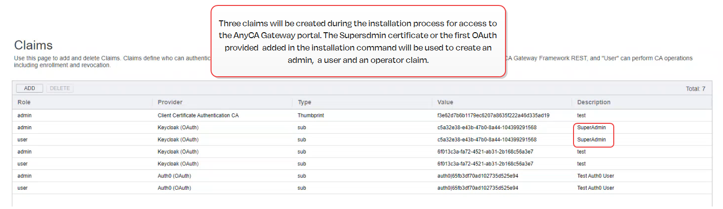 During installation, three claims are created to provide initial access to the AnyCAGateway REST portal. The client authentication certificate or OAuth credentials specified for the SuperAdmin parameter