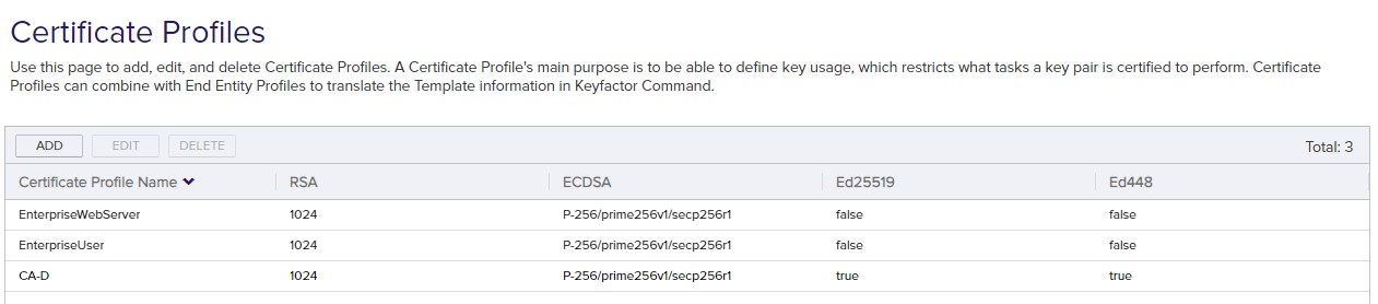 A grouping of CAs. The Microsoft concept of forests is not used in EJBCA so to accommodate the new EJBCA functionality, and to avoid confusion, the term forest needed to be renamed. The new name is configuration tenant. For EJBCA, there would be one configuration tenant per EJBCA server install. For Microsoft, there would be one per forest. Note that configuration tenants cannot be mixed, so Microsoft and EJBCA cannot exist on the same configuration tenant. defined when you added the new AnyCAGateway REST CA to Keyfactor Command. Since the AnyCAGateway REST is added into Keyfactor Command as an HTTPS CA, the templates will import with an end-entity prefix (AnyCA_) and the certificate profile name, such as AnyCA_WebServer. - In Keyfactor Command, configure templates for enrollment