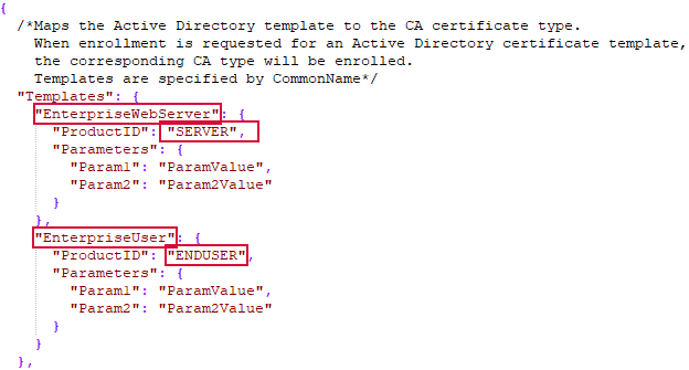 The existing Anygateway will have templates configured similar to the example below, where the Active Directory template name is mapped to the third-party CA product ID. This can be seen in a config.json file generated using the Get-KeyfactorGatewayConfig cmdlet (see Get-KeyfactorGatewayConfig). The AnyCAGateway REST is Active Directory independent, so the template names will not have any meaning to the AnyCAGateway REST. To minimize the amount of reconfiguration required on an upgrade, template mapping will be handled by the upgrade as follows: